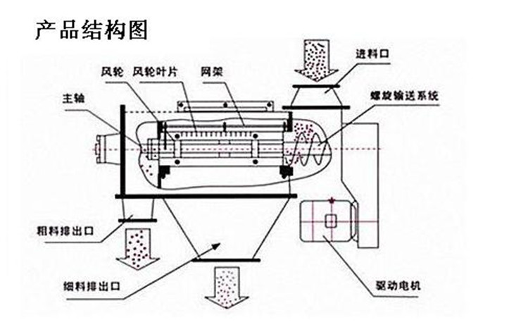 三圓堂臥式氣流篩篩網(wǎng)為圓筒狀,置于機(jī)體內(nèi),物料通過螺旋輸送系統(tǒng)后,和氣流混合、霧化進(jìn)入網(wǎng)筒內(nèi);通過網(wǎng)筒內(nèi)風(fēng)輪葉片使物料同時(shí)受離心力和旋風(fēng)推進(jìn)力,從而能使物料噴射過網(wǎng),由細(xì)料排出口排出,不能過網(wǎng)的物料沿網(wǎng)筒壁從粗料排出口排出。臥式氣流篩目前主要用于冶金、礦業(yè)、制藥、食品、化工、金屬粉末及非金屬等行業(yè)。